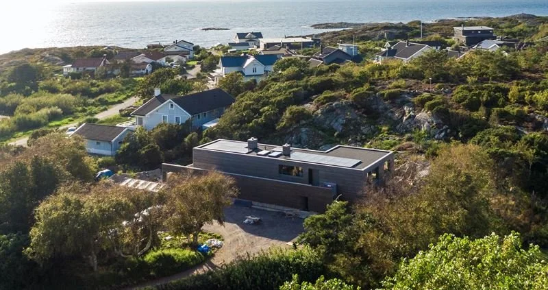 Villa Lerkil är ritad av Gert Wingårdh. EVIA Biostone med träpanel som fasad, lerputs som invändiga ytskikt.